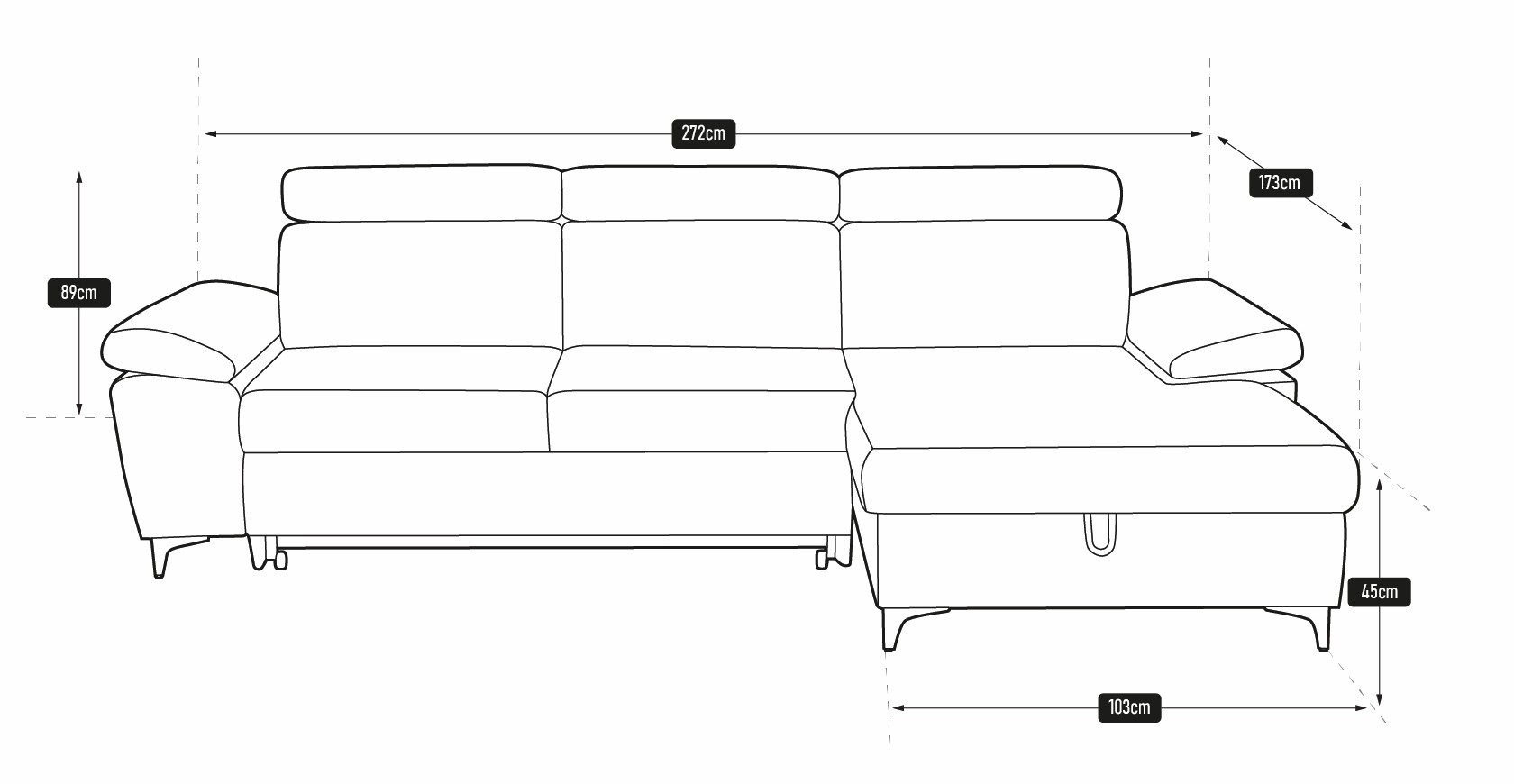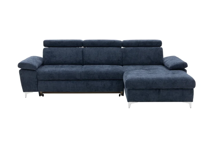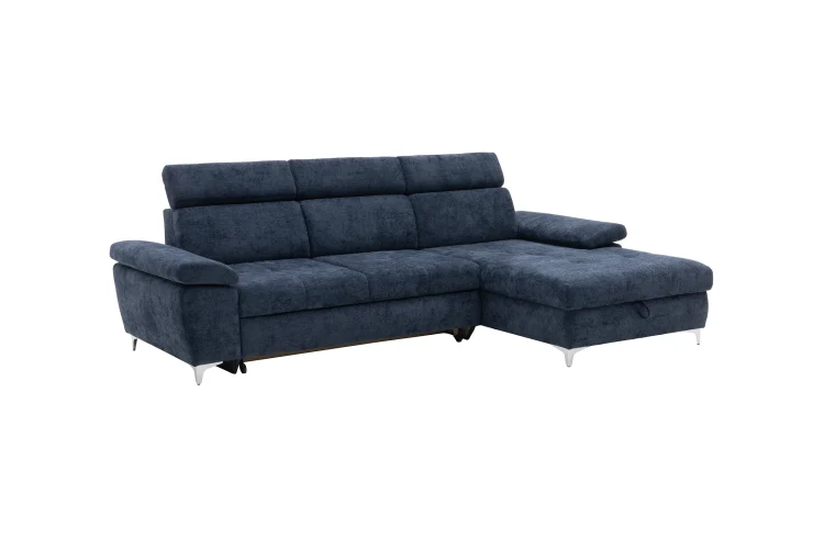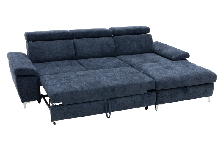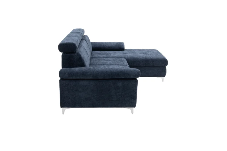 Tapicerowany elegancką tkaniną, doskonale wpisuje się w estetykę współczesnych wnętrz. Wyposażony w regulowane zagłówki, zapewnia indywidualne dopasowanie i wygodę podczas codziennego relaksu. Dzięki funkcji spania szybko zmienia się w komfortowe miejsce do nocnego wypoczynku, a pojemnik na pościel pozwala na sprytne przechowywanie dodatkowych tekstyliów. Smukłe chromowane nogi dodają lekkości i podkreślają nowoczesny charakter mebla.