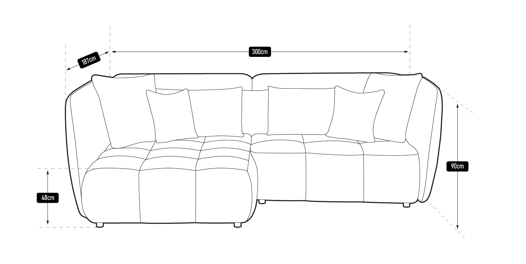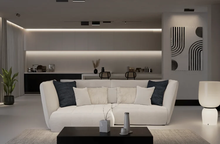 Subtelne pikowania na siedzisku dodają delikatnego charakteru, podkreślając wysoką jakość wykonania mebla. Wysokie oparcia i miękkie poduszki, w odcieniach bieli i szarości, zapewniają wsparcie pleców oraz dodatkową wygodę podczas wypoczynku. Smukłe, lekko ukośne linie podłokietników nadają całości lekkości, jednocześnie dodając nuty nowoczesnej estetyki.